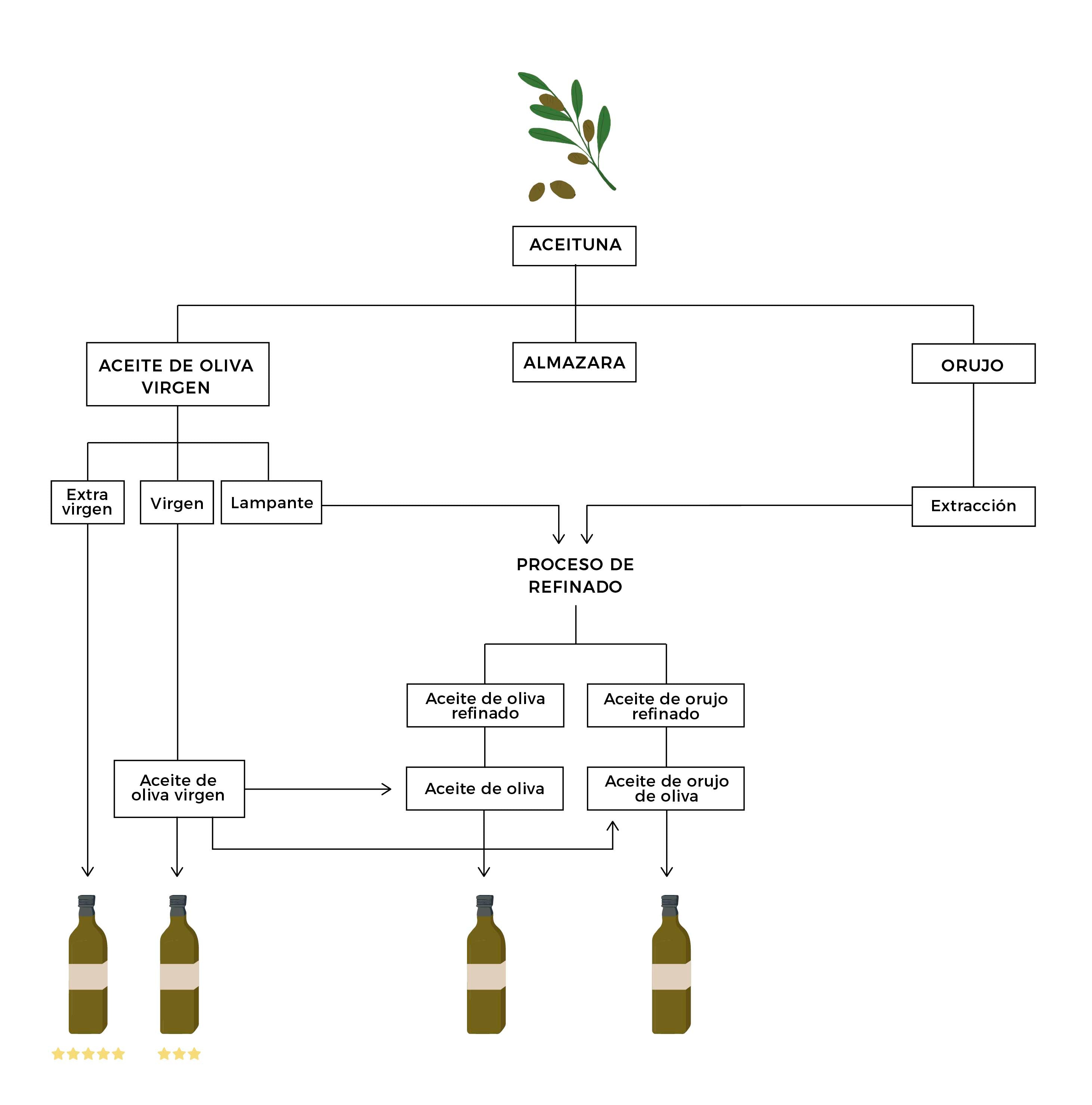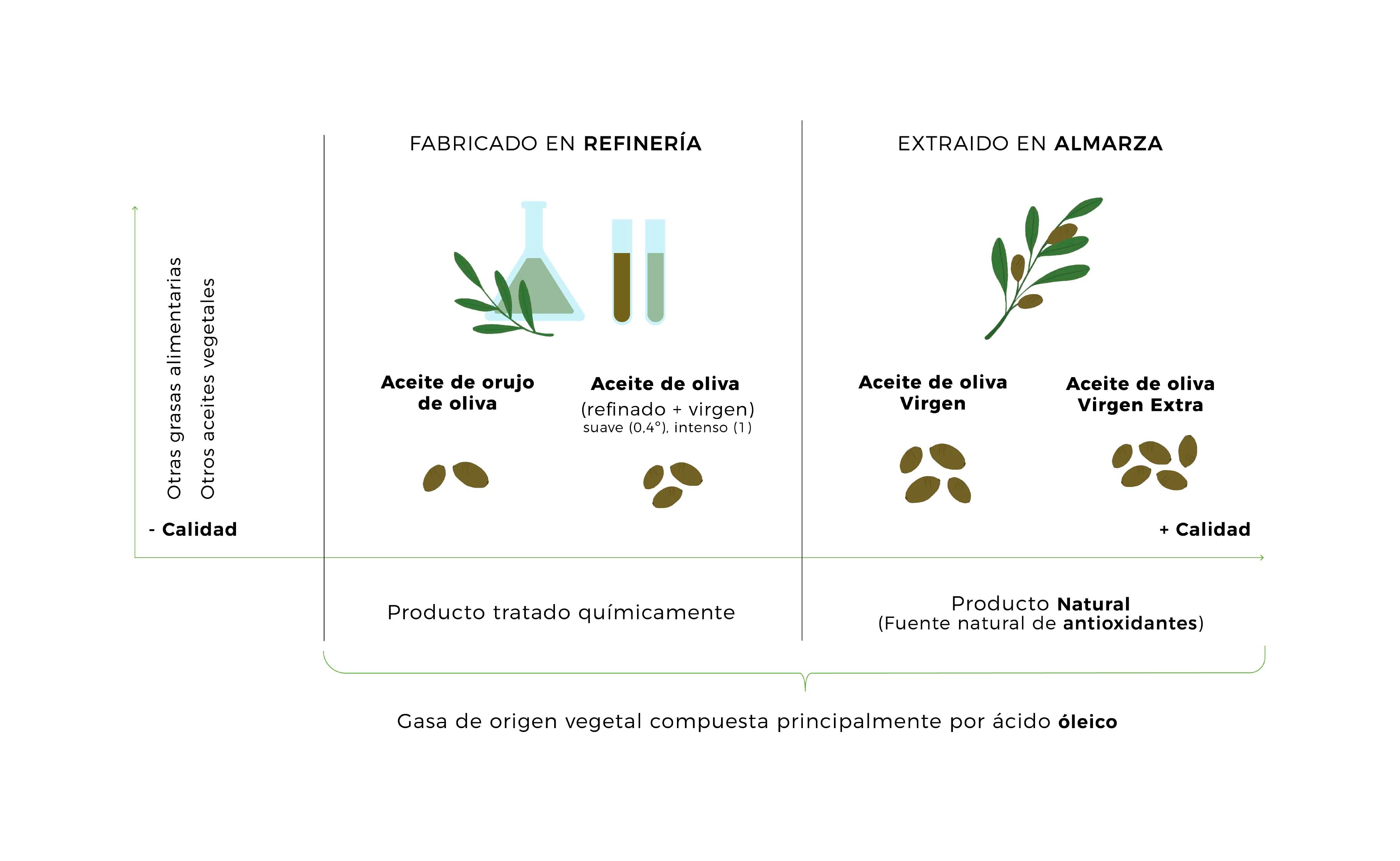 Por último, en el siguiente esquema es posible diferenciar aquellas categorías de aceite de oliva obtenidas a partir de procesos químicos, de aquellas provenientes de procesos naturales.