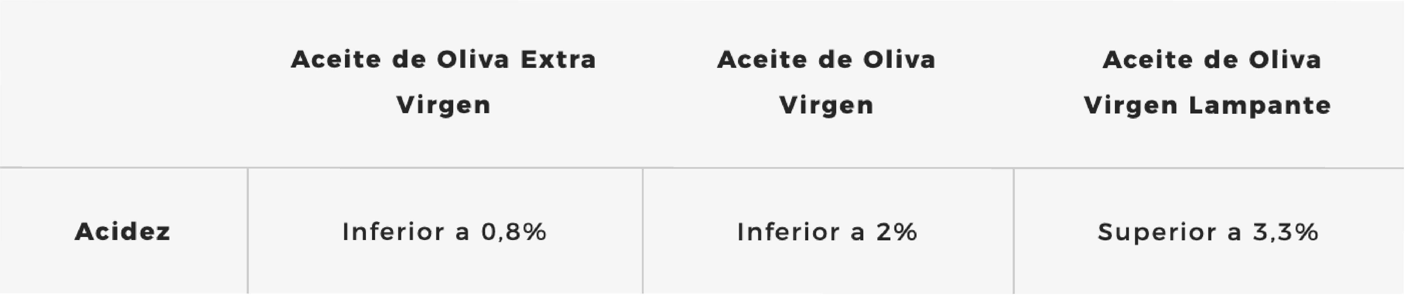Aceite de Oliva Extra Virgen: Se define como aquel aceite de oliva cuya acidez es inferior o igual a 0,8%, con presencia de notas herbáceas y/o de fruta y sin presentar ningún tipo de defecto en el análisis sensorial.